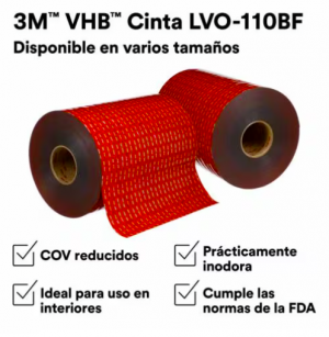 Rango de precios: desde €6,27 hasta €4.950,00 Sin IVALa 3M™ VHB™ LVO-160BF es una cinta acrílica de 1,6 mm con núcleo de espuma conformable y baja emisión de COV, prácticamente inodora y conforme a FDA 21 CFR 175.105….