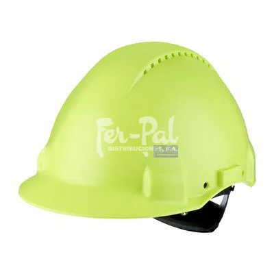 Casco G3000 HI-VIZ (verde, alta visibilidad) con arnés de ruleta y banda de sudor plático.